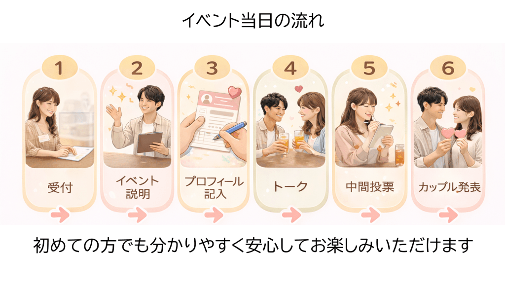 - 1対1で5分ほど異性の方とお話していただきます。